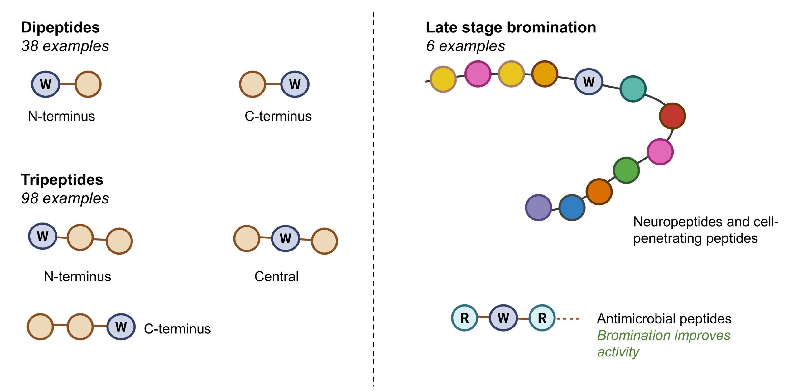 Third, the enzymatic bromination described in this preprint can be expanded further to potentially include other reactions. One such way forward is to introduce other forms of halogenation, such as chlorination and iodination, which would be useful in further modulating the peptides’ physicochemical properties. A more ambitious goal would be to use these enzymes to perform other fascinating reactions such as azidation.