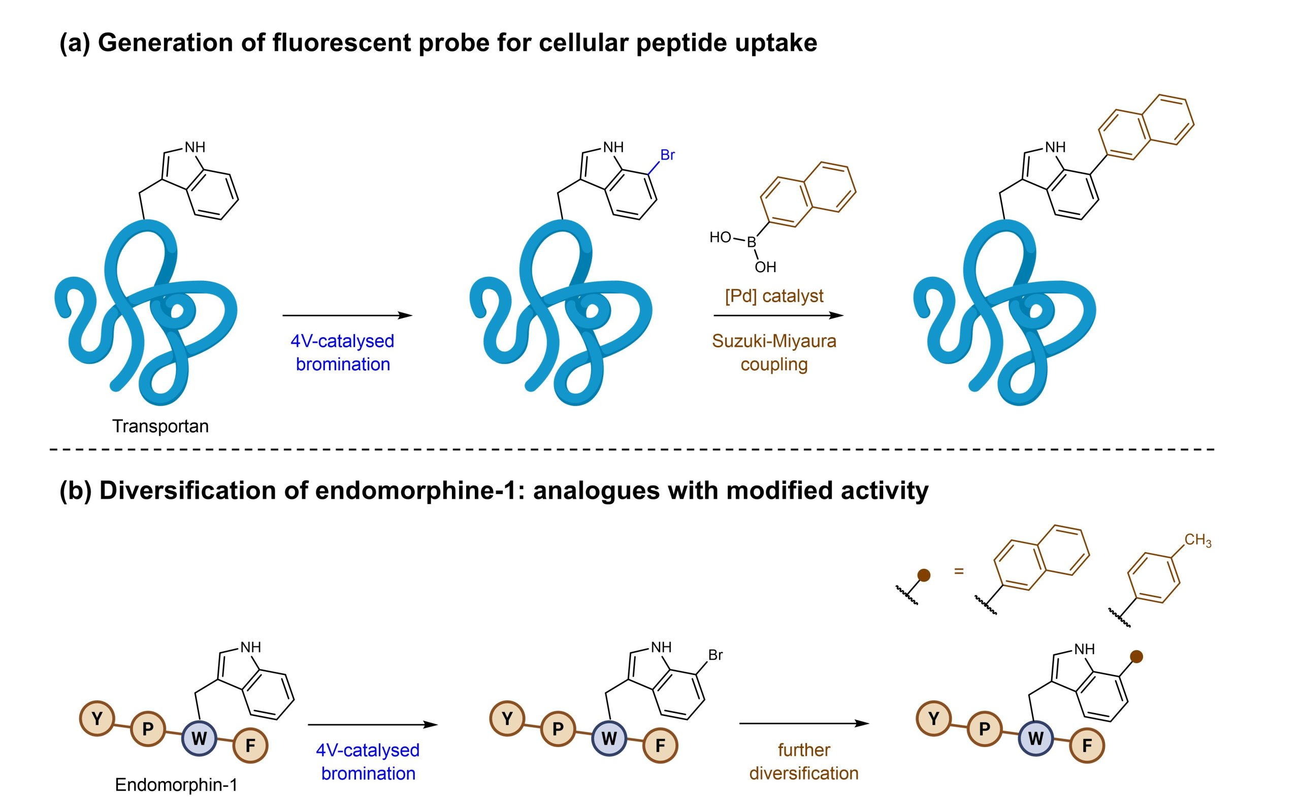 Finally, Bridge and co-workers demonstrated that 4V could brominate more complicated peptides and that the resultant derivatives could undergo further functionalisation (Figure 2). Here, two specific uses were illustrated: (a) the subsequent generation of a fluorescent probe for cellular peptide uptake with a naphthyl-modified peptide, as well as (b) the diversification of endomorphin-1, a μ opioid receptor agonist, to create analogues with modified activity.