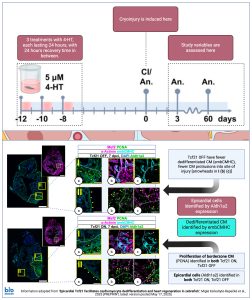 Background: After myocardial injury in the zebrafish and under physiological conditions, quiescent epicardial cells activate throughout the heart, a response that peaks by day 3 after injury. These cells then cover the injured area, a response occurring by day 7 after injury. Cardiomyocytes in the border zone also protrude, or even actively migrate into the injured area; this involves cardiomyocyte dedifferentiation and proliferation [1] [2]. The epicardium is involved in this regeneration process, secreting appropriate signaling factors and serving as a source of diverse cell types such as vascular smooth muscle cells and fibroblasts [3]. Secreted factors include proteins such as fibronectin and collagen whilst the epicardium-derived cells (EPDC) enter the subepicardial tissue and transdifferentiate into the previously mentioned cell types [4].