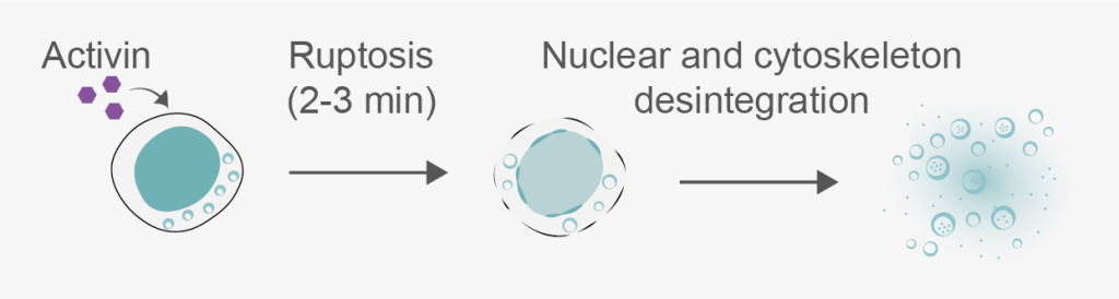 Figure 1- Mechanism of Ruptosis. Ruptoblasts are activated by the hormone activin, inducing rapid and explosive cell lysis. This process is characterized by synchronized membrane rupture and actin depolymerization, leading to the release of cytotoxic granules.