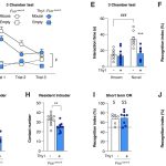 Figure 4 (adapted from source and made available under a CC-BY-NC-ND 4.0 International license): 4d: Social interest with new mice in an open chamber; over the course of three times trials, isolated Fus transgenic mice exhibited less interest in social interaction. 4e-f: Social memory and recognition activity of meeting previous mice was impaired in Fus mice. 4g-h: The time to react with other mice and total number of interactions among wild-type (WT) and Fus mice; generally, Fus mice spent less time contacting with new (“intruder”) mice in an open chamber than WT mice. 4i-j: Short and long term memory did not vary much between WT and Fus mice in foreign object recognition tests.