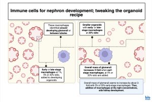 Immune cells for nephron development; tweaking the organoid recipe! In the preprint highlighted here, the authors use human PSC-derived organoids to evaluate the contribution of macrophages to kidney development.