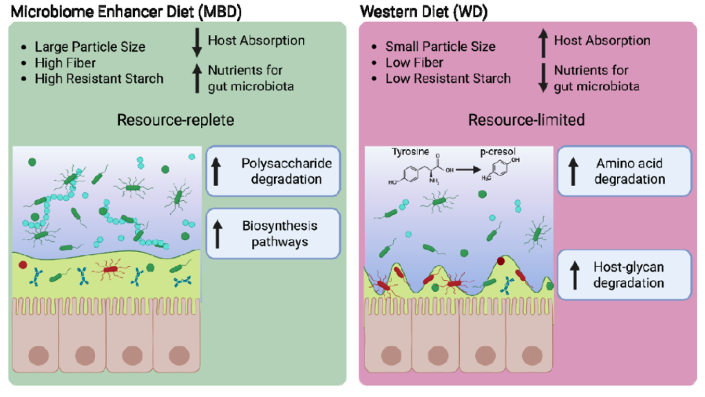 In this preprinted study, Dirks and collaborators conducted clinical trials to compare the functional activities of microbial gut communities when eating a low fibre, Western Diets (WD), compared to a high fibre, Microbiome Enhancer Diet (MBD). Participants were assigned to either the WD or MBD for 22 days straight, then given 14 days to resume their normal diet, followed by another 22 days of eating the opposite diet to the one they were first assigned. Throughout the study, participants were closely monitored and fecal samples were collected to measure differences in microbial composition and function for 11 days during each diet. Metatranscriptomic techniques were used to quantify the active gene expression of the microbial communities.