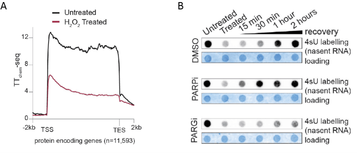 To dissect the mechanisms underlying transcriptional repression and recovery following oxidative stress, the authors combined genome-wide profiling of RNAPII occupancy (ECLAP-seq) with nascent transcription analysis (TT-seq). At the promoter-proximal region, analysis of RNAPII distribution around transcription start sites (TTS) revealed that oxidative stress induces a redistribution of paused RNAPII complexes (Figure 1A). By depleting the pausing factor NELF, the authors show that NELF is not required for the global shutdown of transcription. Instead, it modulates the positioning of early elongation complexes, promoting a transient shift of RNAPII pausing from the canonical first pause site to a second pause site associated with the +1 nucleosome during stress and recovery. In addition, using pharmacological inhibition of PARP1, the authors demonstrate that PARylation acts as a reversible brake on early RNAPII elongation. High levels of PARylation coincide with transcriptional repression and blocking PARP1 activity promotes the release of RNAPII complexes, without preventing the initial transcriptional shutdown. Finally, transcriptional recovery requires the active removal of PAR chains by the poly(ADP-ribose) glycohydrolase PARG, indicating that PARylation must be rapidly reversed to permit RNAPII reactivation (Figure 1B).