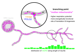 Despite being famously coined the “powerhouse of the cell”, the mitochondria are specialized for many other functions beyond ATP production, such as calcium buffering, fatty acid breakdown, amino acid synthesis and cell death. Several of these functions are vital for a needy cell such as neuron, and its complex architecture indicates the mitochondria must be specialized depending on the neuronal compartment in which it operates. How are these mitochondria kept “fresh” in long-projection cells such as afferent sensory neurons? Tejashree P. Waingankar & colleagues discovered a crucial piece of this puzzle: the possibility of mitochondrial replenishment far away from the cell body.