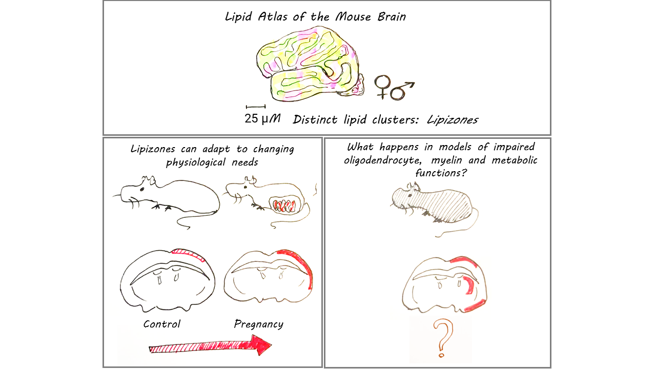 supertype with enrichment of 151 lipids and moderate increase of phosphatidylcholines was apparent in females. Pregnancy, on the other hand, resulted in major lipid remodeling, particularly in the outer cortex and myelin-rich regions, showing increased levels of specific myelin-associated lipids (HexCer 42:2 and sphingolipids) as well as region-specific remodeling which extended to the ventricles, hindbrain, cerebellum and hypothalamus. Collectively, their findings highlight how the lipidome is dynamic, responds to regional regulation, and can adapt to physiological states.