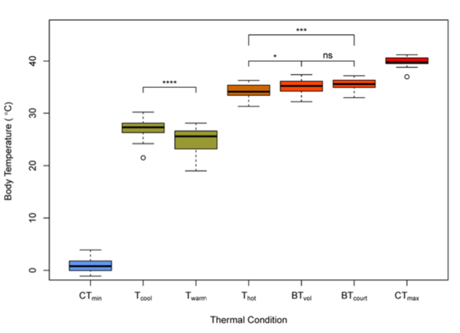 Answer: I actually think about this a lot, and while we haven’t dug into it deeply, I wonder if this behavioral plasticity might hit a limit when environmental temperatures rise too far. Will the window between the courtship maximum temperature and critical thermal maximum temperatures just keep getting smaller as the environment warms up? Previous work looking at thermal limits in this species suggests that the physiological thermal threshold isn’t really changing, leading us to believe that they are currently overcoming the challenges of a warming climate primarily using behavior. I’m not sure that this is a winning long-term strategy.