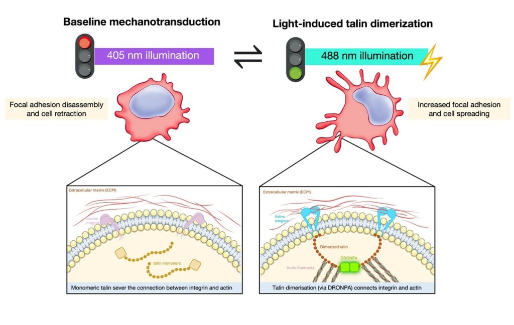 Find both graphical abstracts here – “Flip a switch, control cell adhesion”: https://prelights.biologists.com/highlights/optogenetic-control-of-mechanotransduction-based-on-light-induced-homodimerization-of-talin/